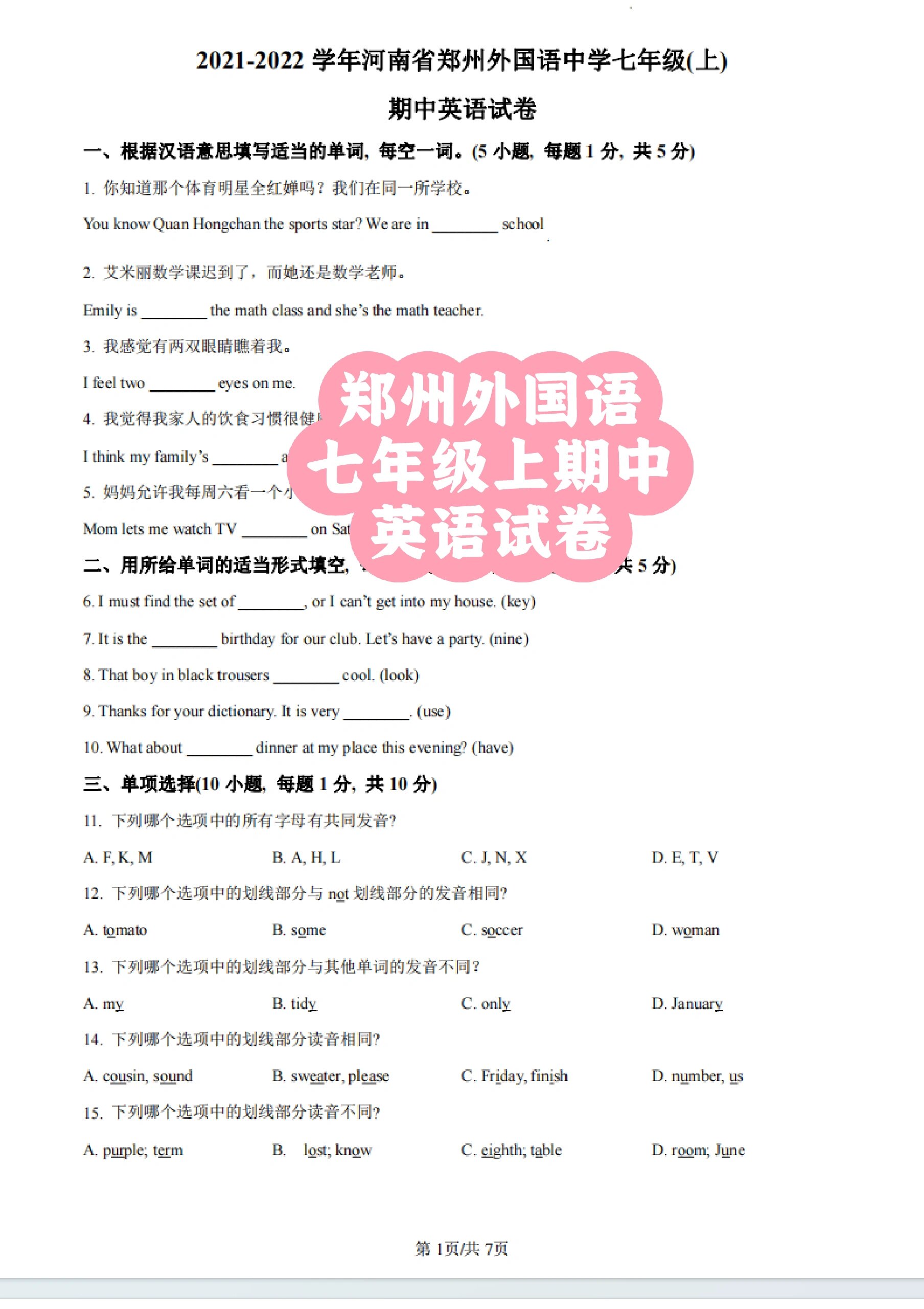 期中考试降至,今天王老师为同学们整理了七年级上册英语期中常考句型转换6大题型训练含答案,提前练习掌握!七上英语句型;今天,王老师和大家分享的是初一英语上册期中复习必背优秀作 我喜欢它,因为它很有趣我每一天都上英语课我会讲一点英语;学习难度明显增加,学科上也增加了英语和科学那么,期中考试 七上八下五花八门 半斤八两九牛一毛九死一生千秋万代。
