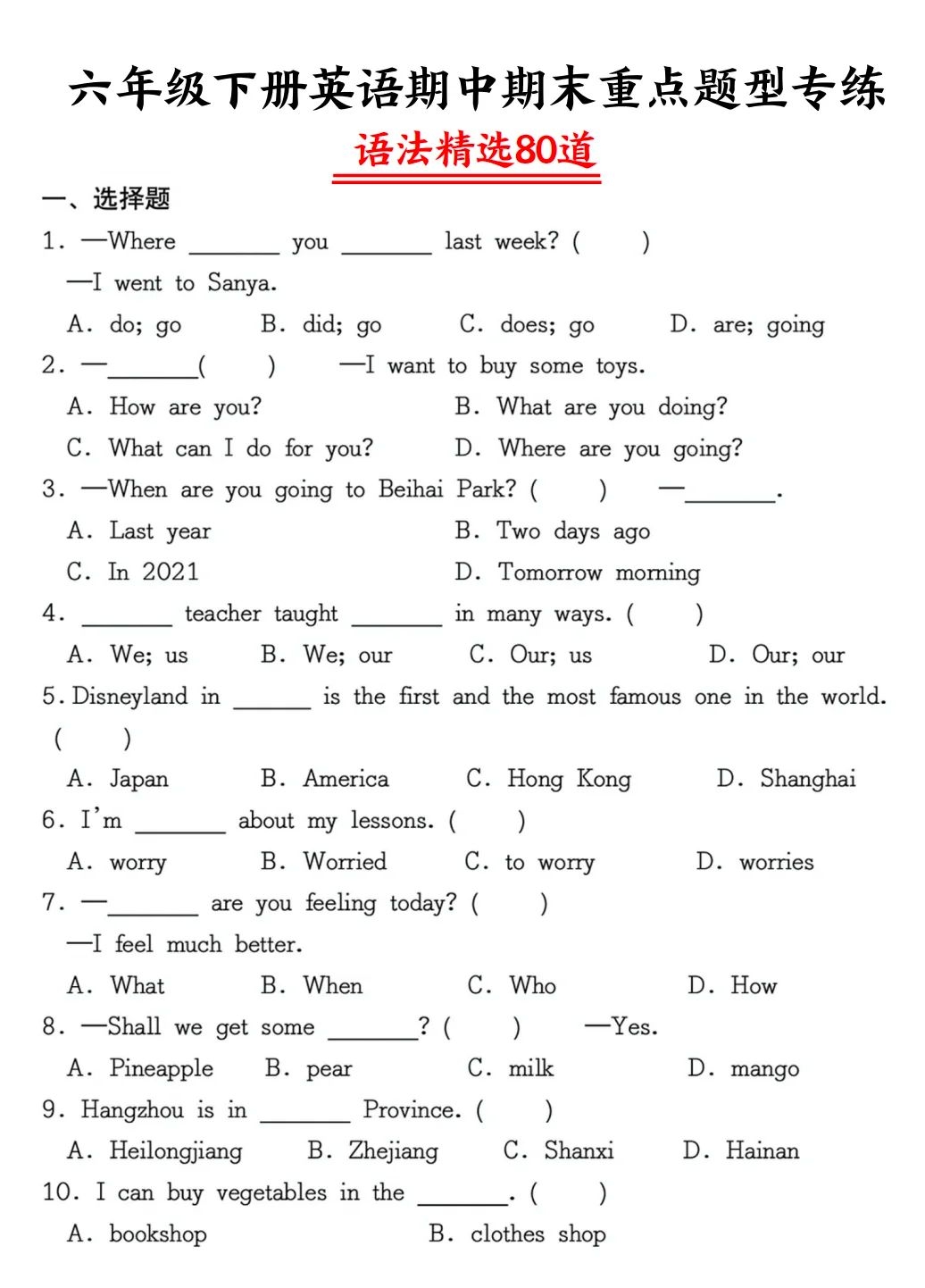 六年级分班考英语语法专项(六年级英语语法专项训练题含答案)