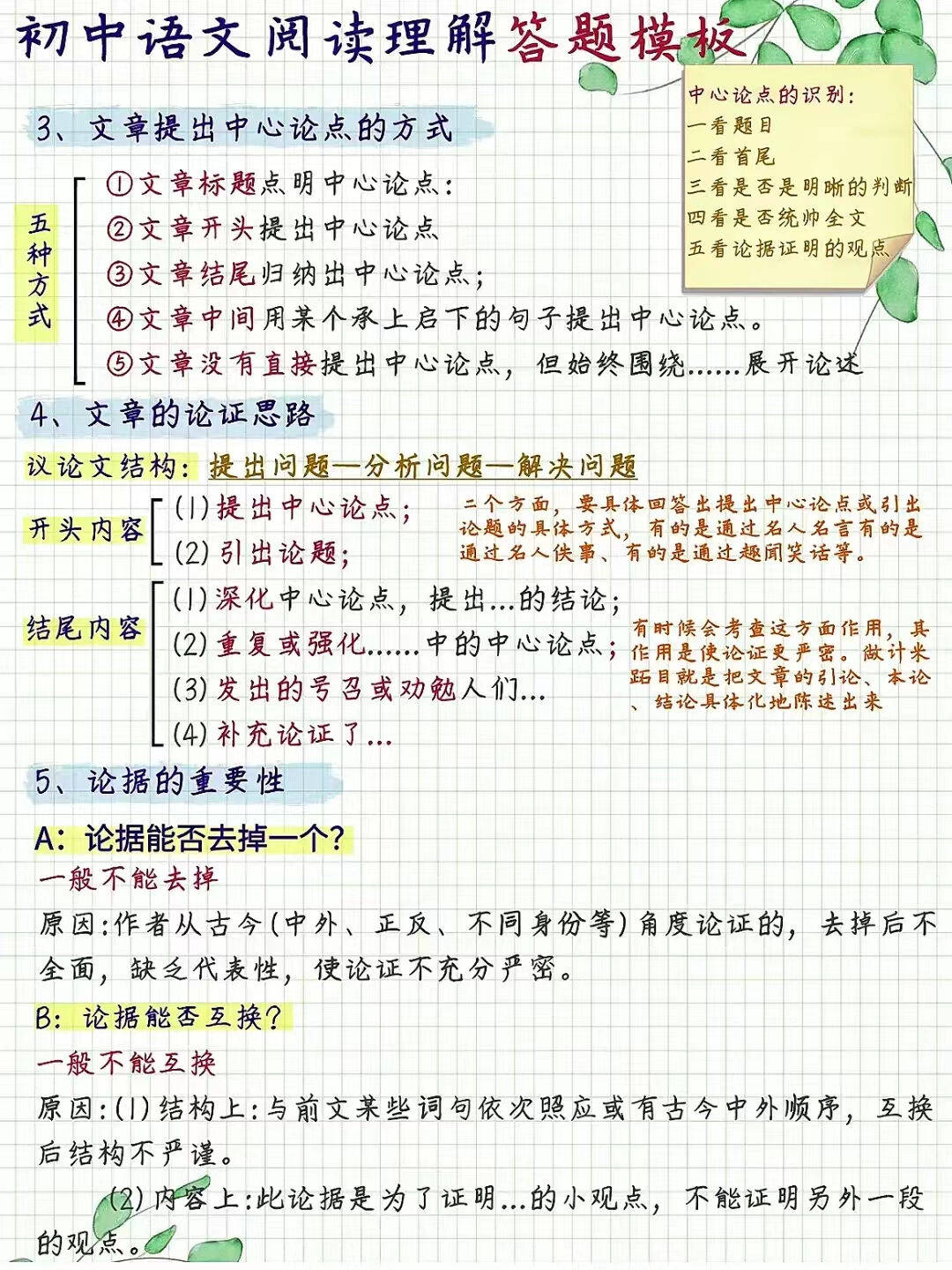 1、中考倒计时,大家再坚持几天,我们顶峰相见!今天我们一起梳理下议论文的答题技巧,按题型归纳如下 一概括中心论点 1明。