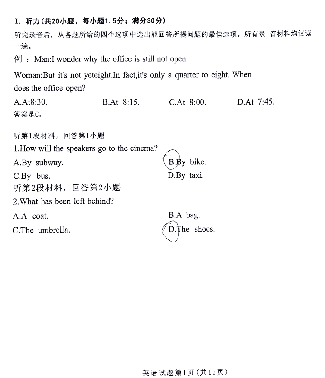 5、2021年高考英语浙江真题部分素材2021浙江高考英语听力音频及文字目前没有完整版本试题,只有部分网络整理真题截图如下。