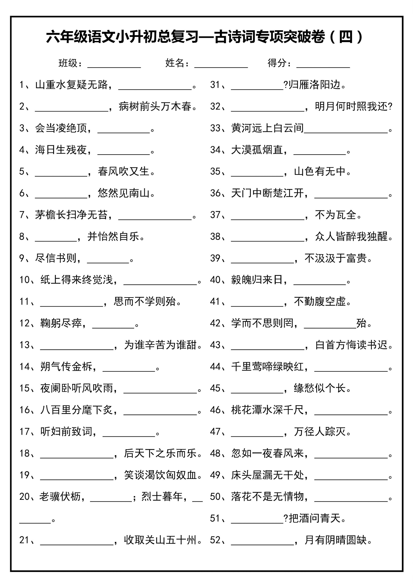 4、古诗词是小学语文考试必考的一大重难点题型,今天王老师给大家整理了六年级语文小升初古诗词专项练习题含答案,帮助孩。