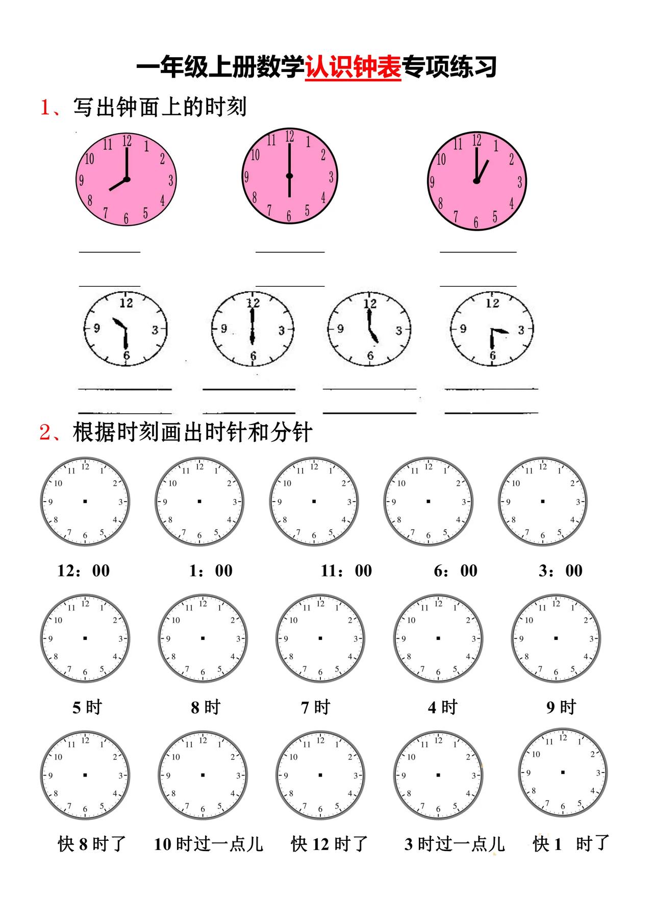 王老师整理了小学一年级数学上册认识钟表知识点+同步练习,请收藏!知识点1认识钟面钟面钟面上有12个数,有时针和分针。
