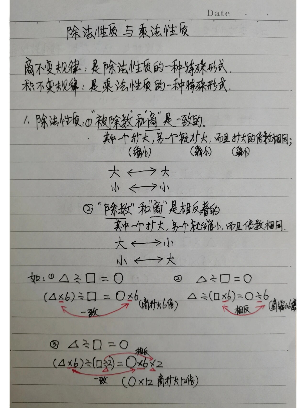 除法的性质在除法里,被除数和除数同时扩大或缩小相同的倍数,商不变7 0除以任何不是0的数都得08简便乘法被乘数;二是能够计算两位数除两三位数的笔算除法三是经历探索的过程,理解商不变的性质,并能应用性质简算四是理解两组数量关系。